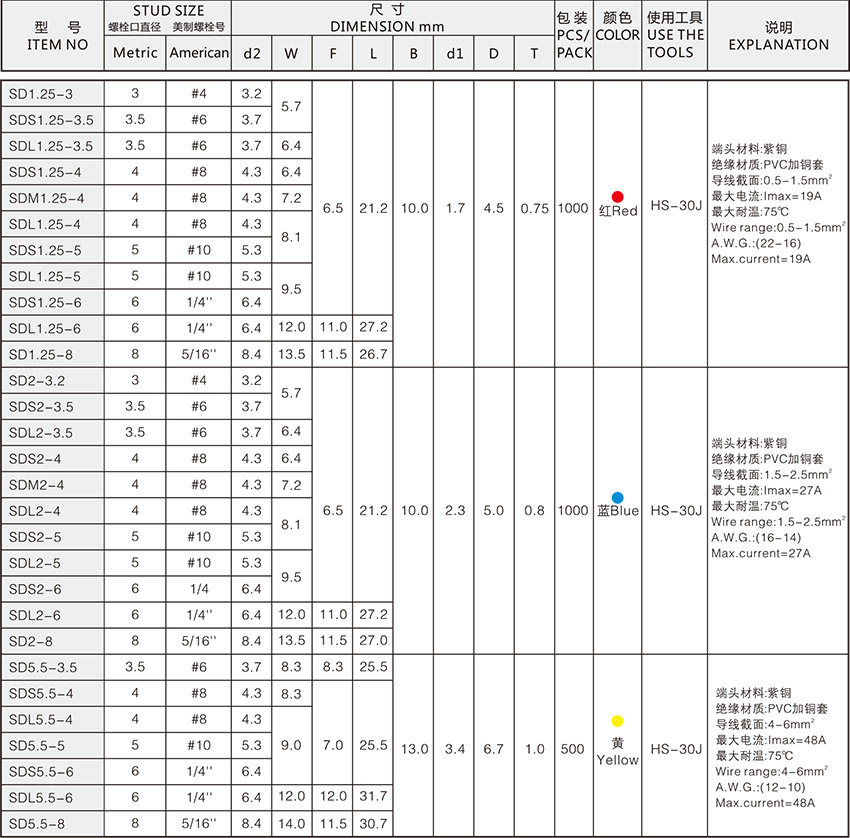 产品概述:SPADE TERMINALS Material Insulation:Vinyl Terminal Body:Copper Metallic Sleeve:Copper Plating:Tin